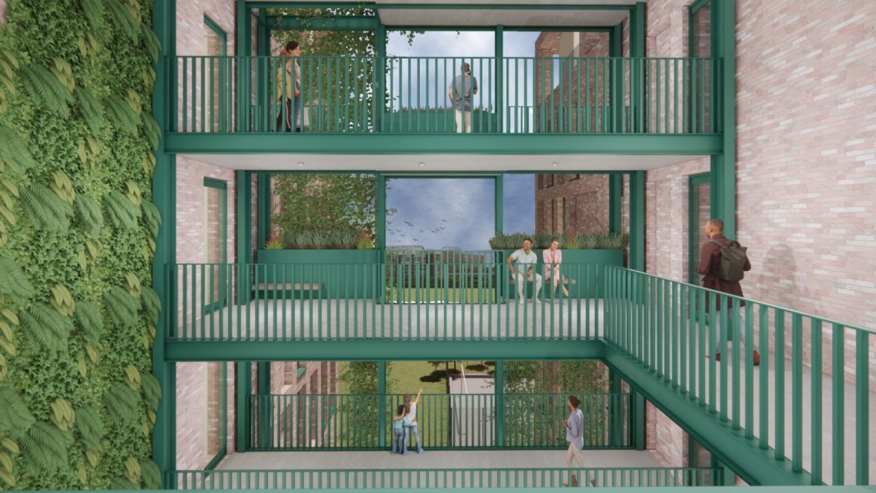 Linking the residential blocks are a series of green, lightweight steel platforms. This industrial design aesthetic responds to the heritage of the area and represents an honest architectural approach. Creating open, semi-enclosed external spaces that seamlessly blend the indoors with the outdoors. This motif is echoed in the balconies, further reinforcing the cohesive and integrated nature of the entire architectural scheme.