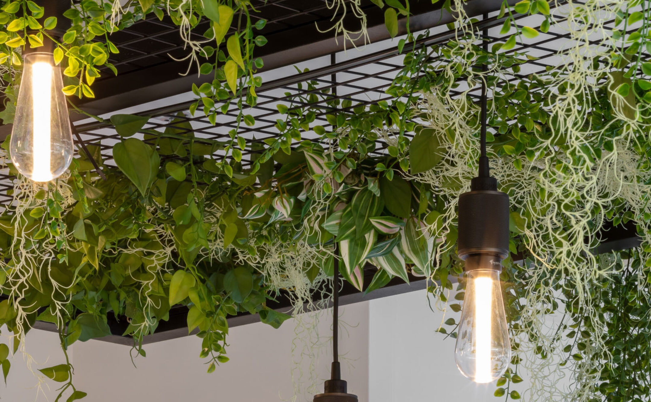 From the bespoke storage solution located behind reception which guides the eye up to the existing atrium, to the café area greenery-filled partitions. Planting features heavily within the project not only to act as a practical screening solution but also to create an environment that promotes wellbeing and productivity.