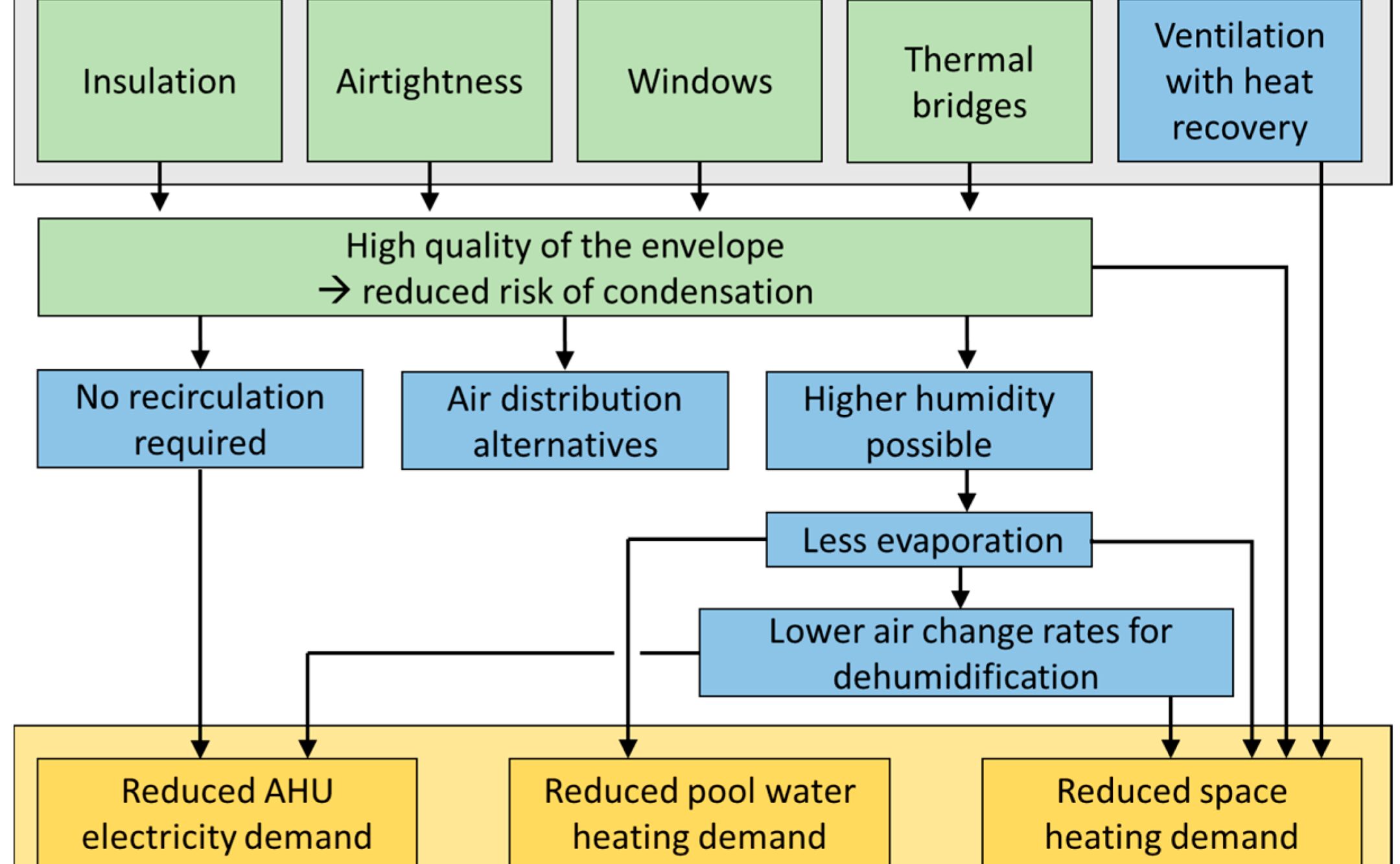 - By utilising rejected heat from rooms like the gym to heat rooms with great heating demands, such as the swimming pool.