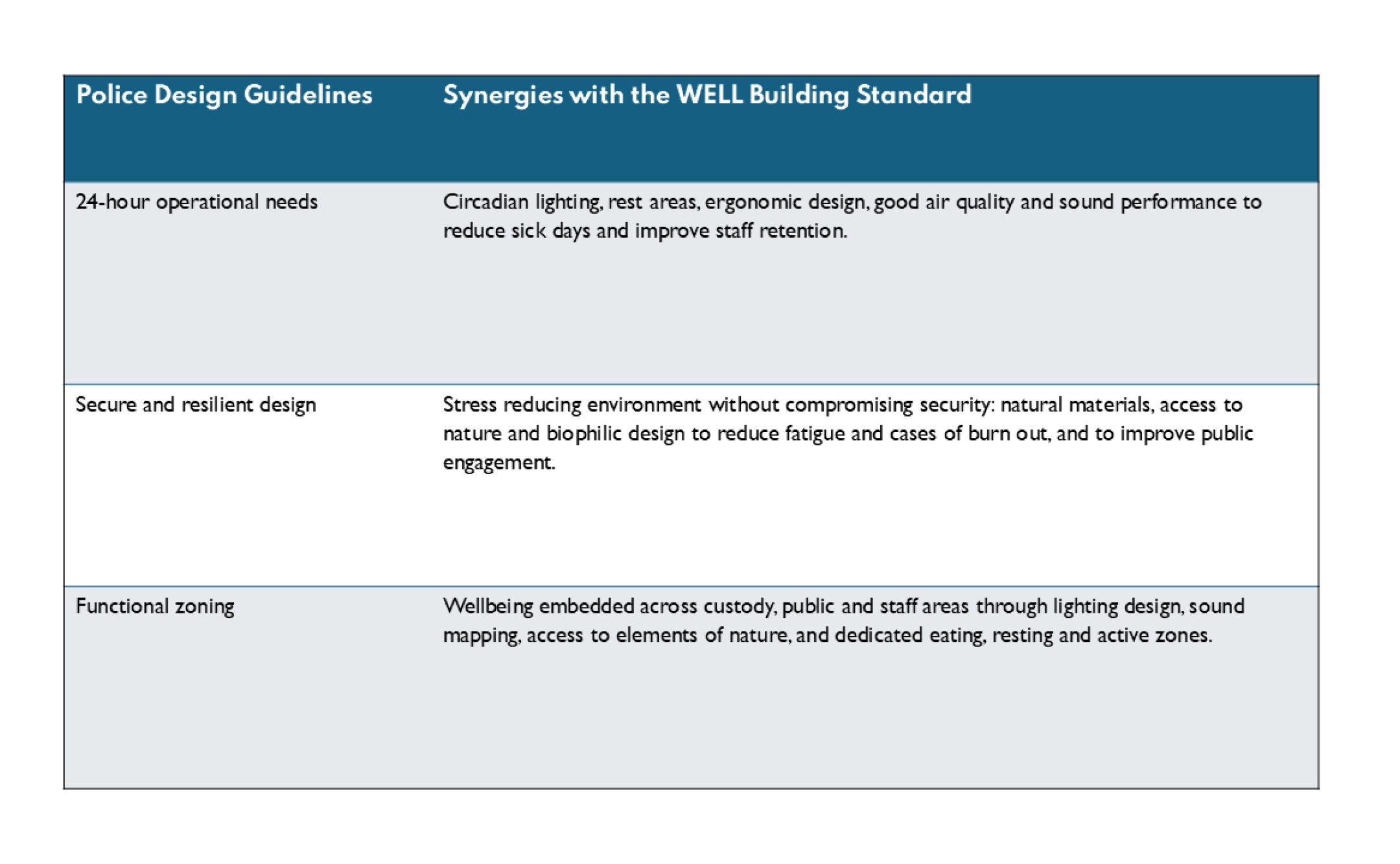 As an example, and taking reference from police design guidelines, it is clear that a number of synergies with WELL standards exist: