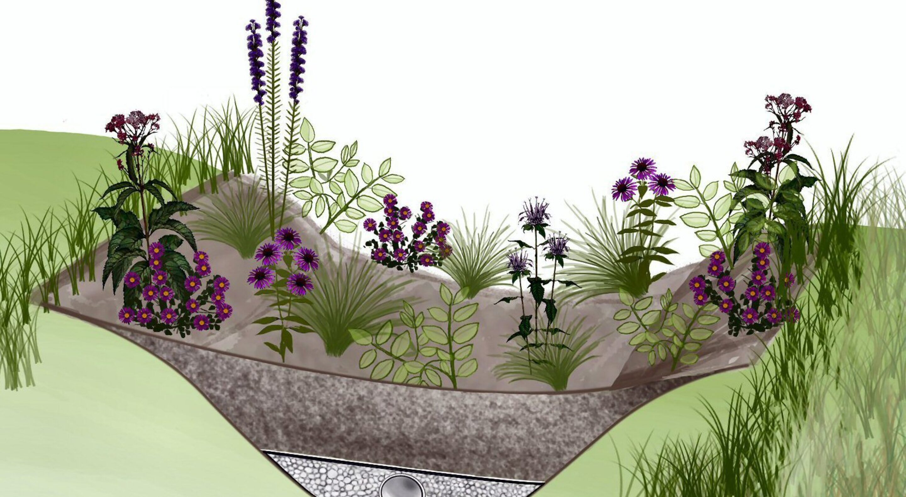 The detention basin is sited immediately prior to discharge into the watercourse attenuating and controlling flows. The rain garden solution provides flood protection at an affordable cost with substantially reduced impact on the community.