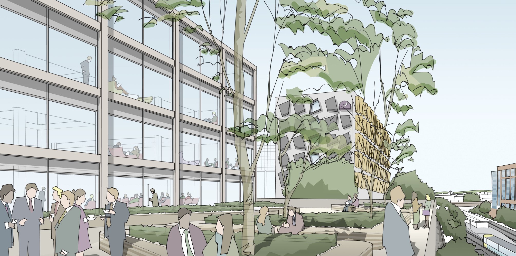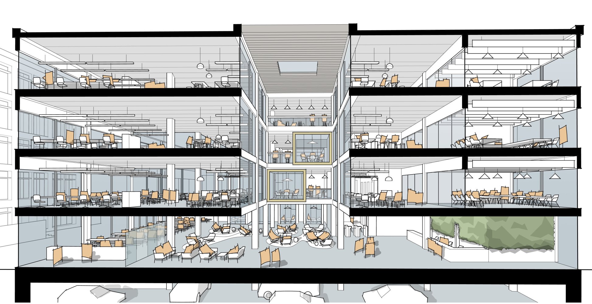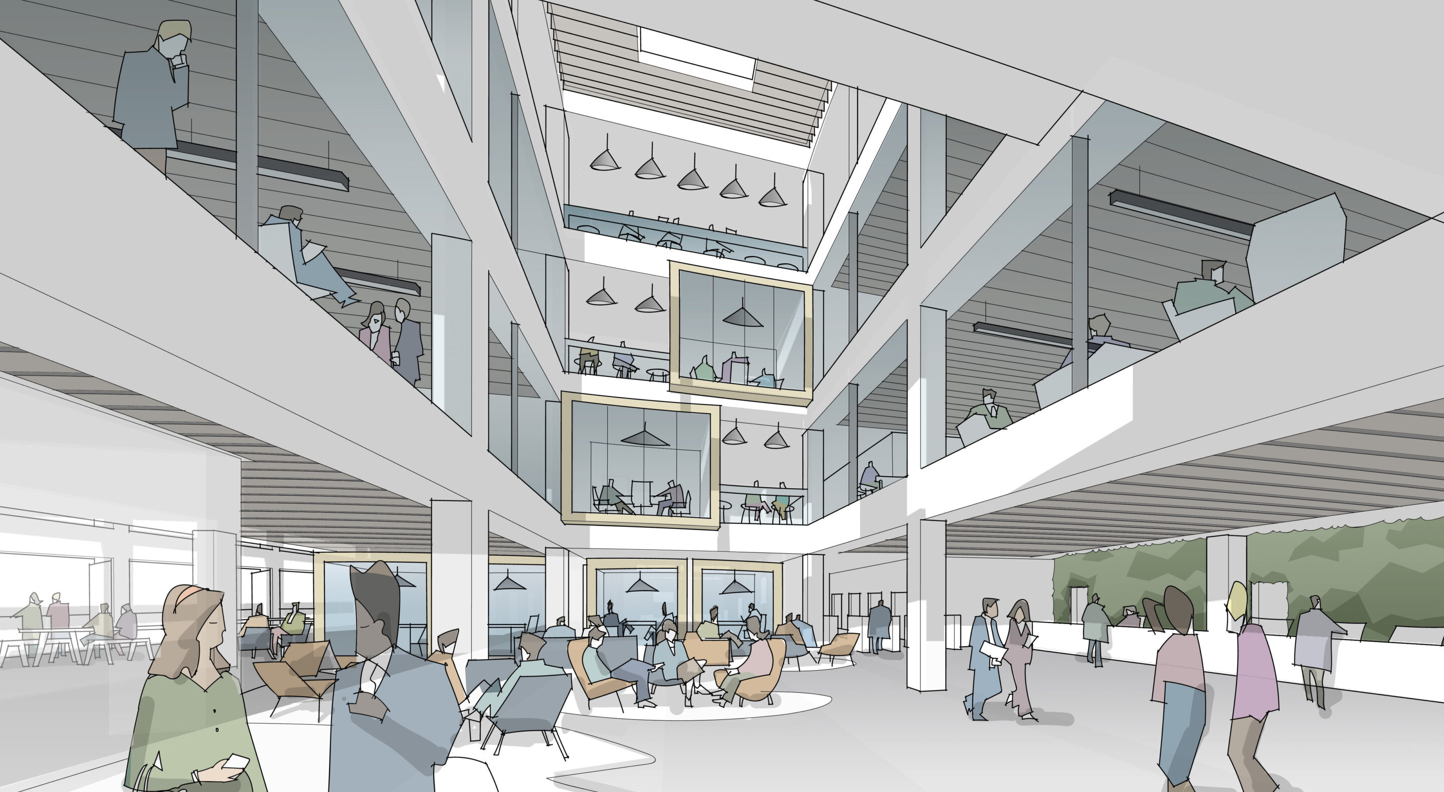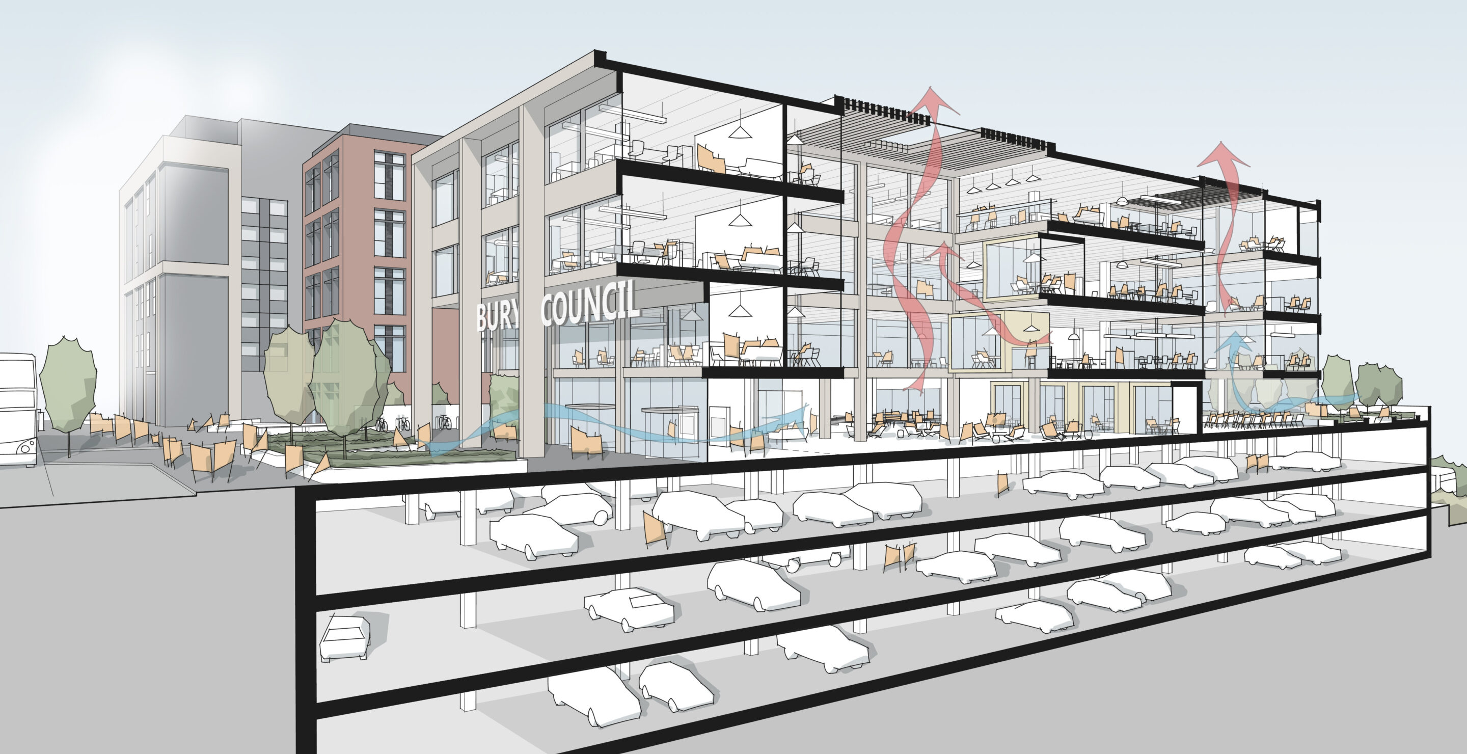 Our feasibility proposals provided Bury Council with plans, sections and sketch visualisations for the exterior and interior, in addition to material palette and precedents to inform the design strategy. These included a large customer reception area, space for a ground floor café/bar and potential commercial lets, and a large space for Bury Council’s Cabinet to hold meetings in. Offices were proposed to be open plan with high density desks and breakout areas, and mixture of formal and informal meeting spaces.