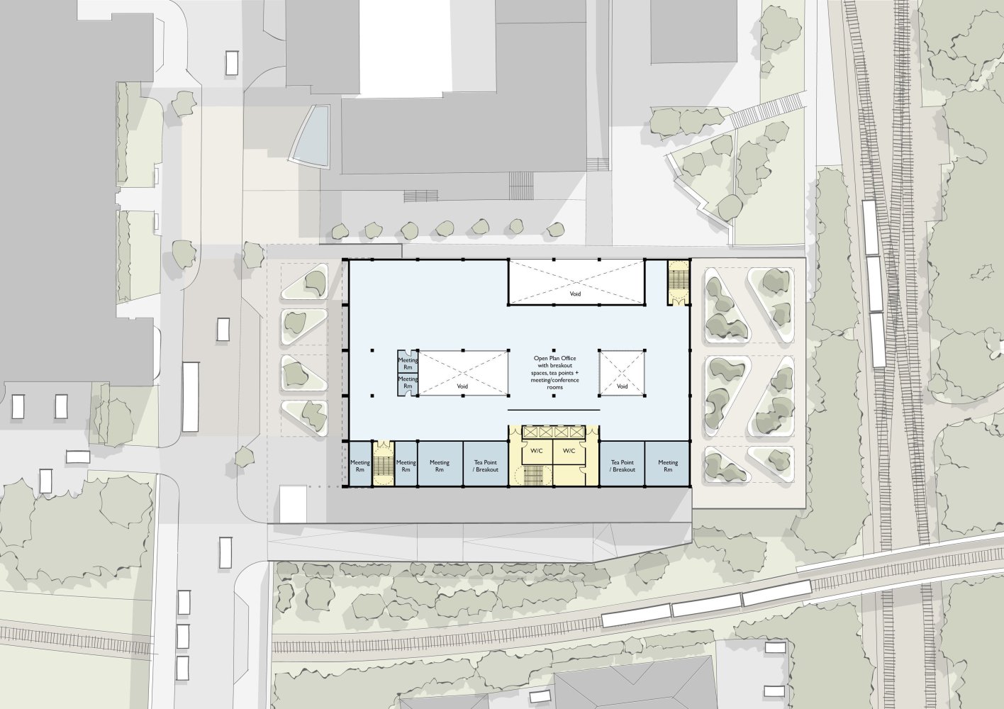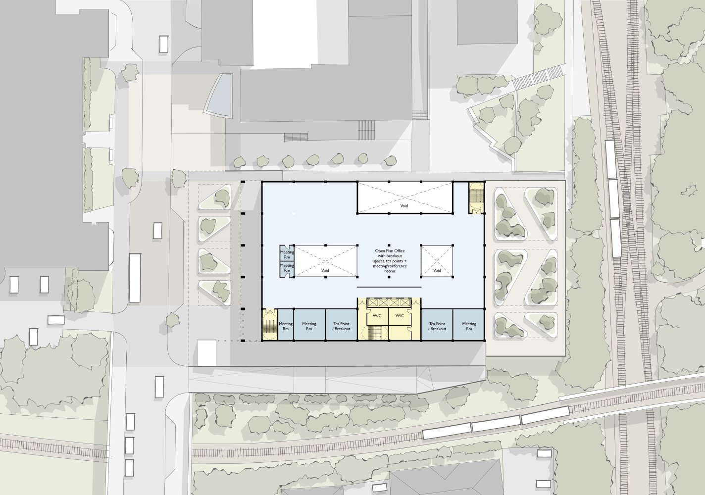 We provided design and surveying services in support of this, providing feasibility options for two new build options. One was for a 50,000 ft2 office over two storeys and the other for 75,000 ft2 over three storeys. Both were proposed to be constructed above an existing three-storey car park in Bury.