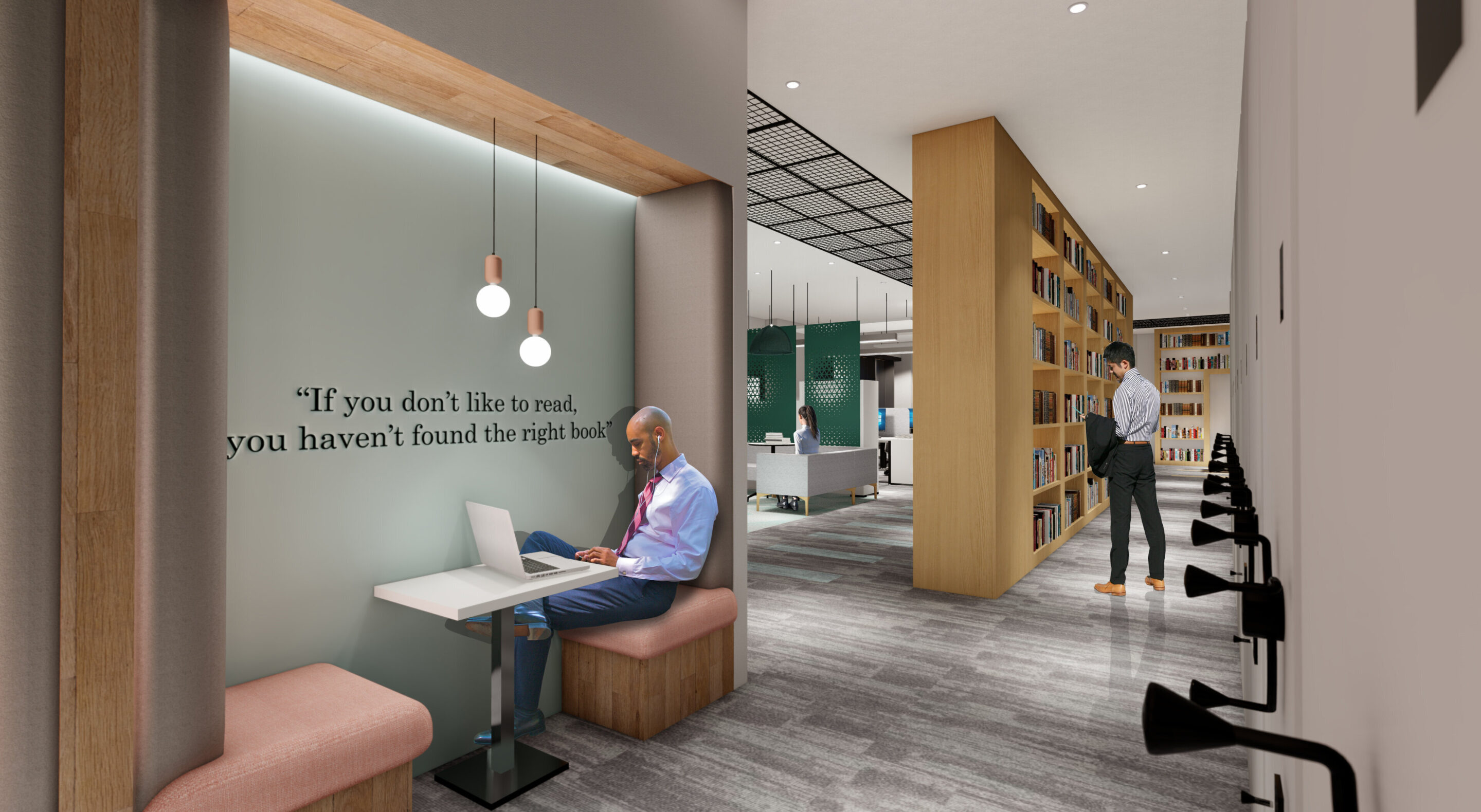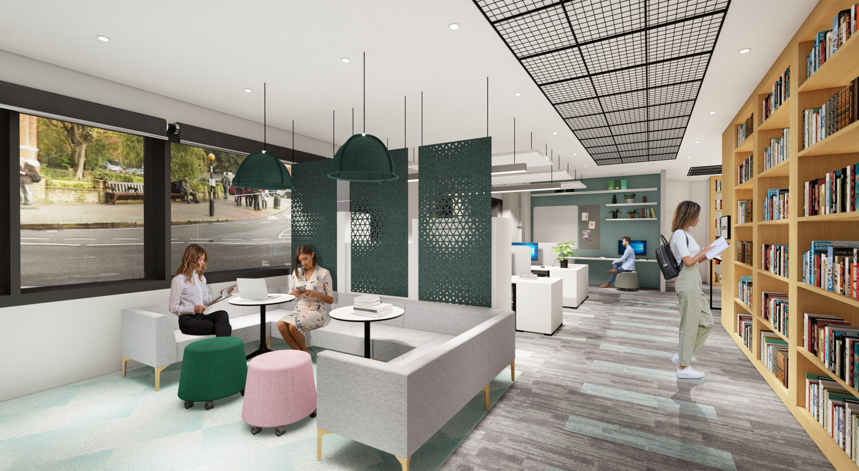 The interior design team has developed three proposed design options for the refurbishment of Caxton House Library. Developing a modern library and working environment designed to increase footfall.