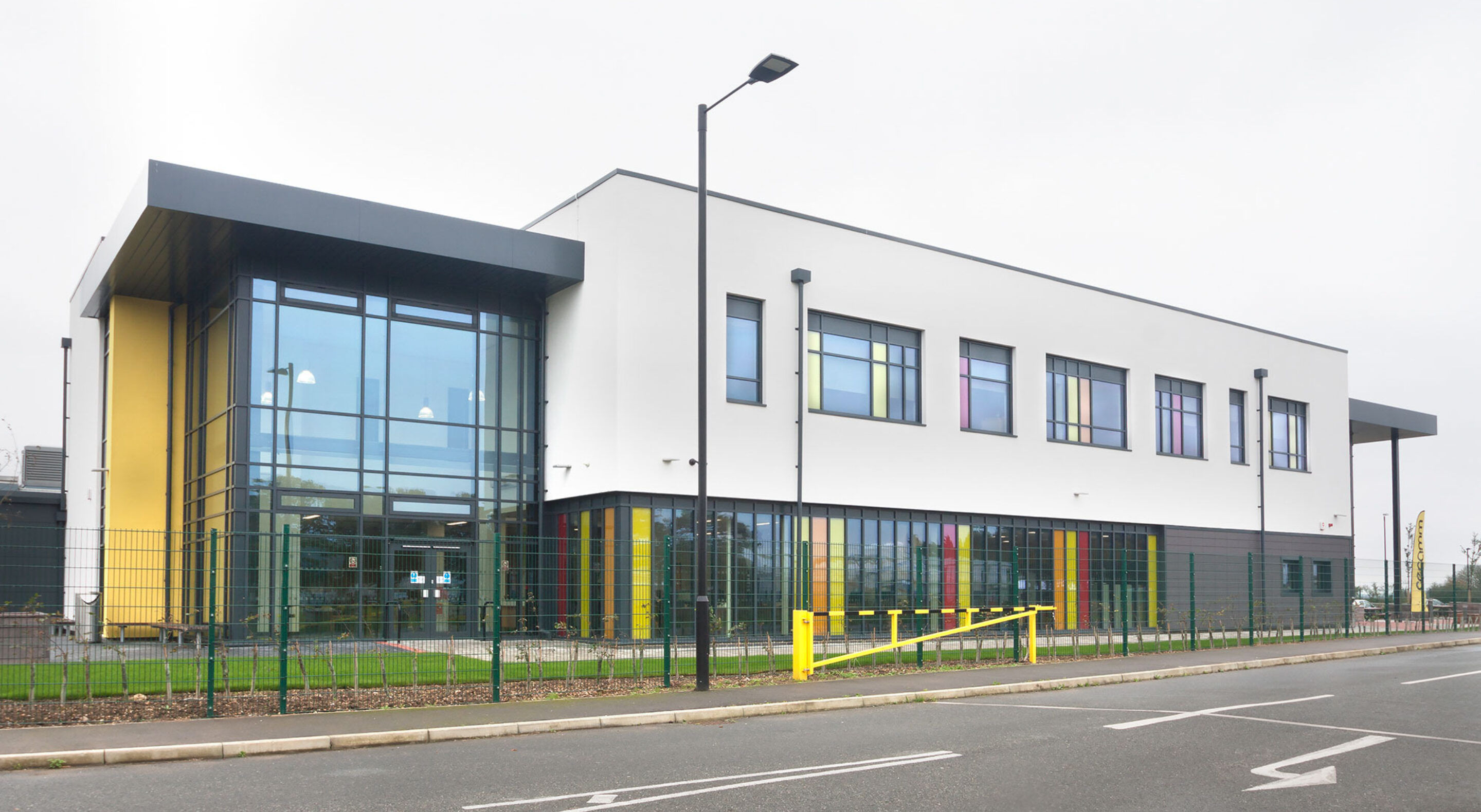 Spaces designed by our team provide a clear span for future proofing, with clear and flexible services distribution system. The elevational treatment of the main block follows on from the branding developed on the main campus with a combination of rendered full height elements and feature aluminium rainscreen panels.