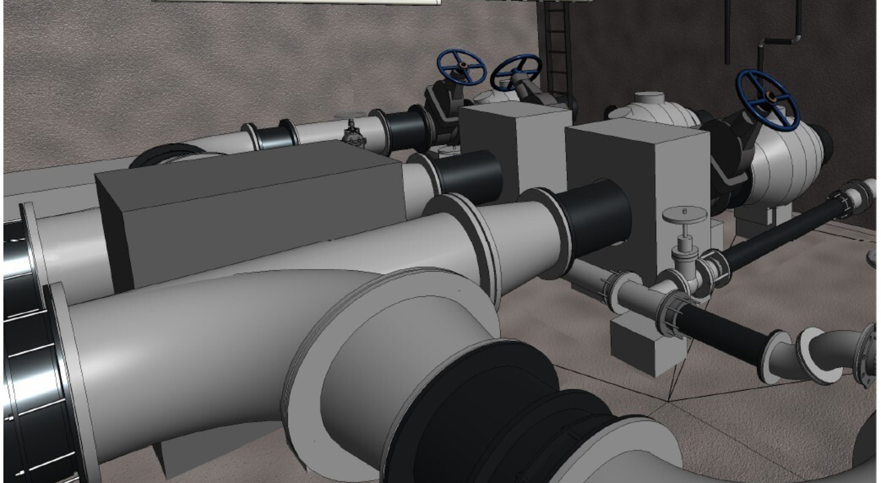 The existing valve chamber was surveyed and a 3D scan undertaken. By importing this scan into Revit, we developed a full 3D model. This was then used to design a pipework layout.