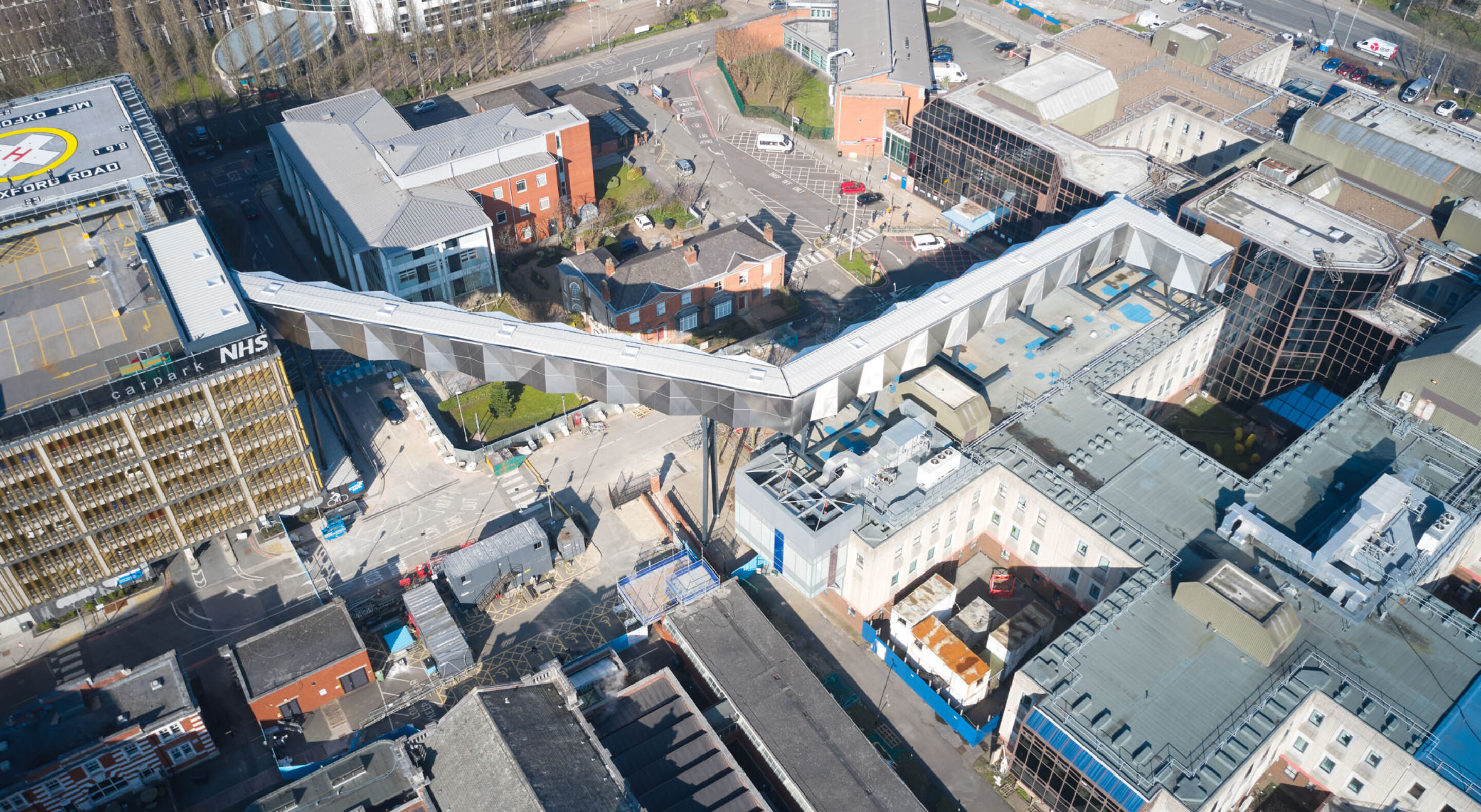 The rooftop link bridge over-sails the car park access road, runs along the roof of a live ward block, and then interfaces with an extended lift core to transfer patients into the main hospital building.
