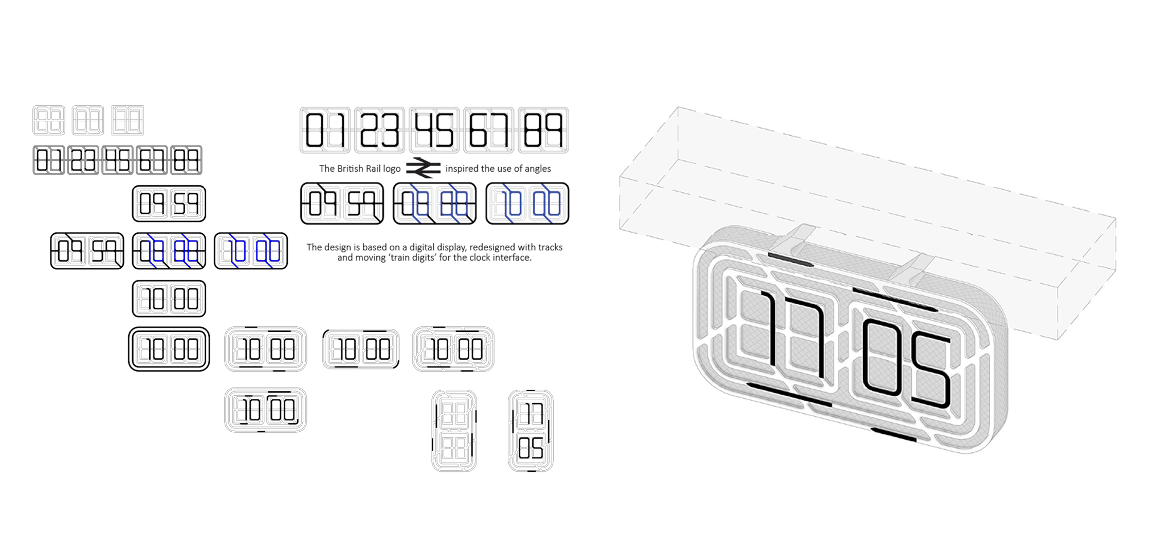 Ryan Morris' design was also selected for further exploration. Ryan’s thinking stemmed from the brief calling for a timepiece that could be ‘customised in an easy and cost-effective manner to reflect place and a station’s location within the British Isles’.