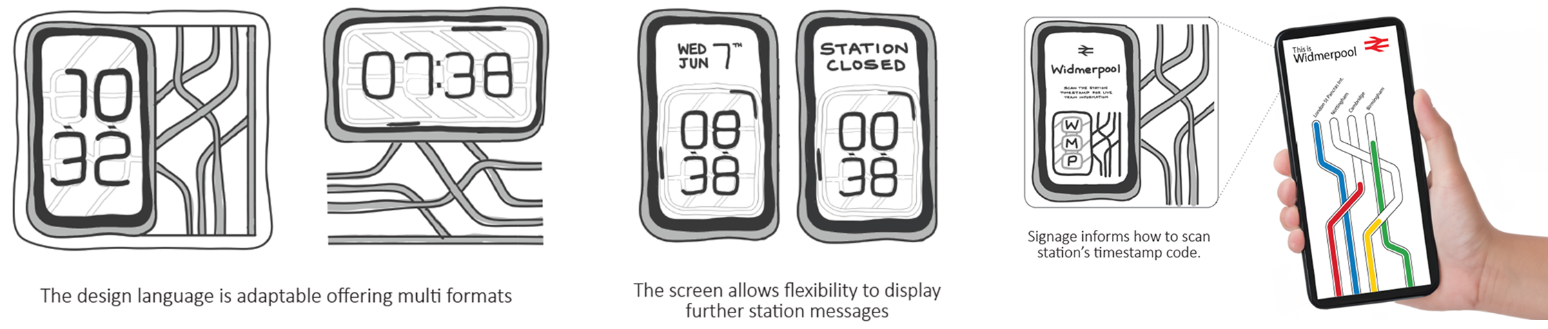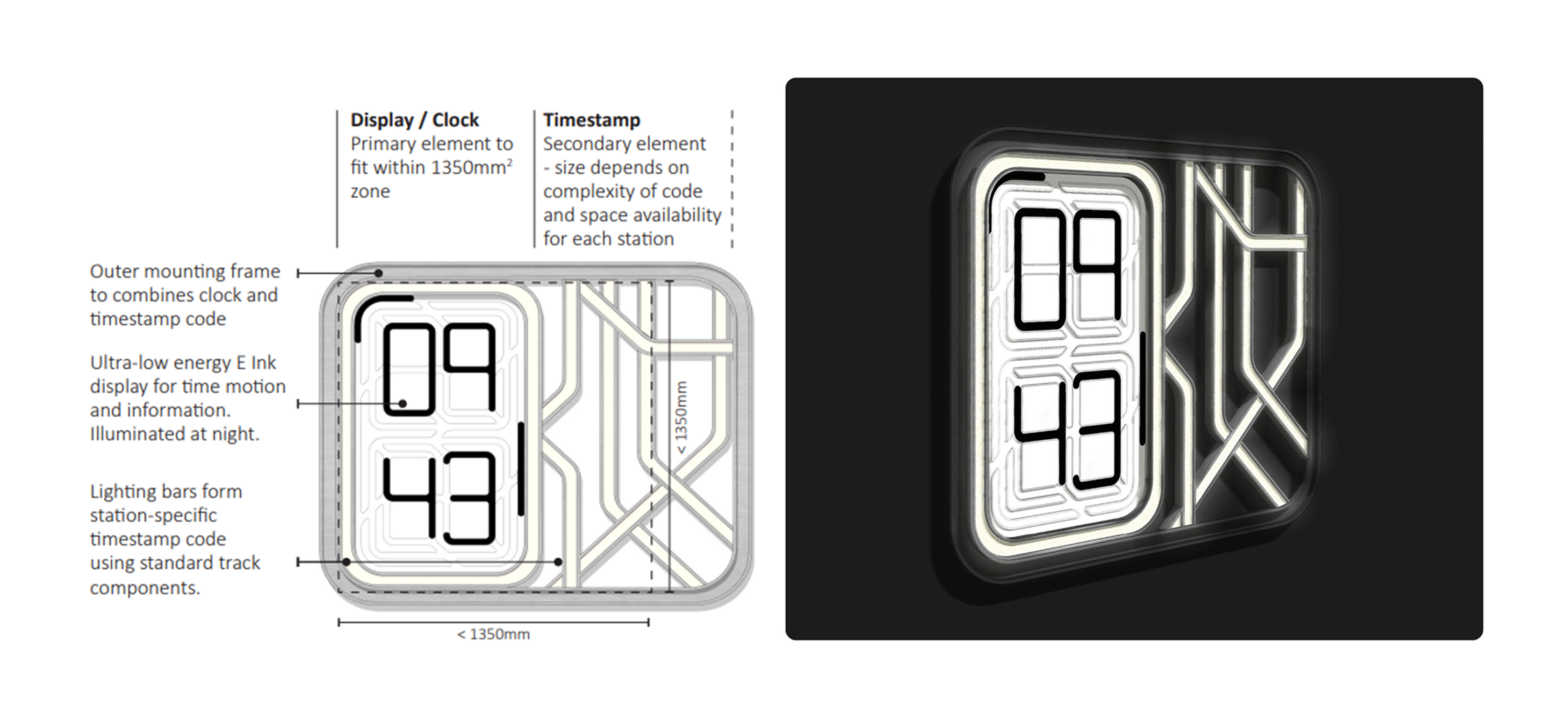 Additionally, a “Station Timestamp” would feature a bespoke station symbol displayed alongside the clock, or individually in the station, allowing passengers to scan it with a smart device for real-time train information.