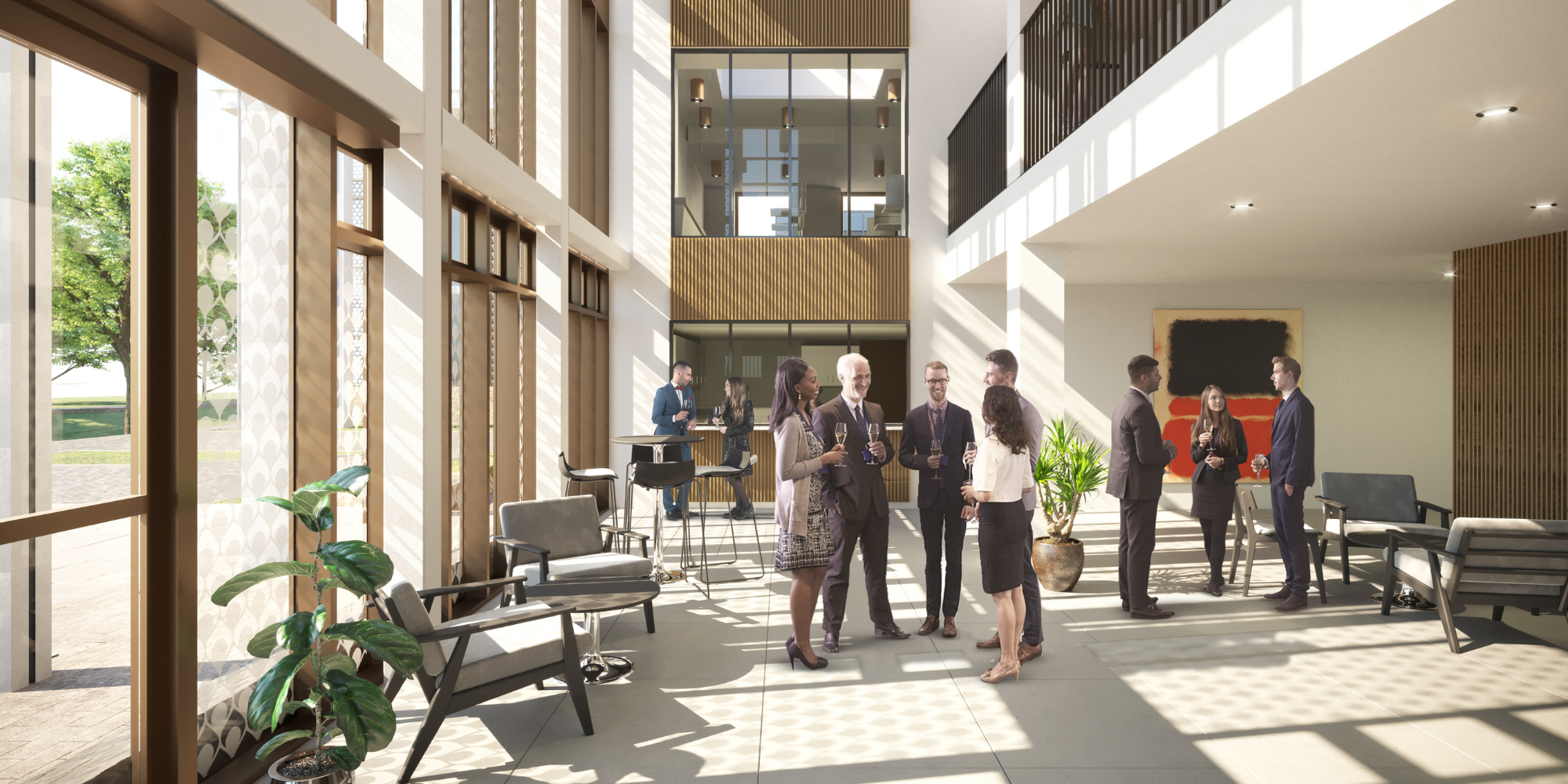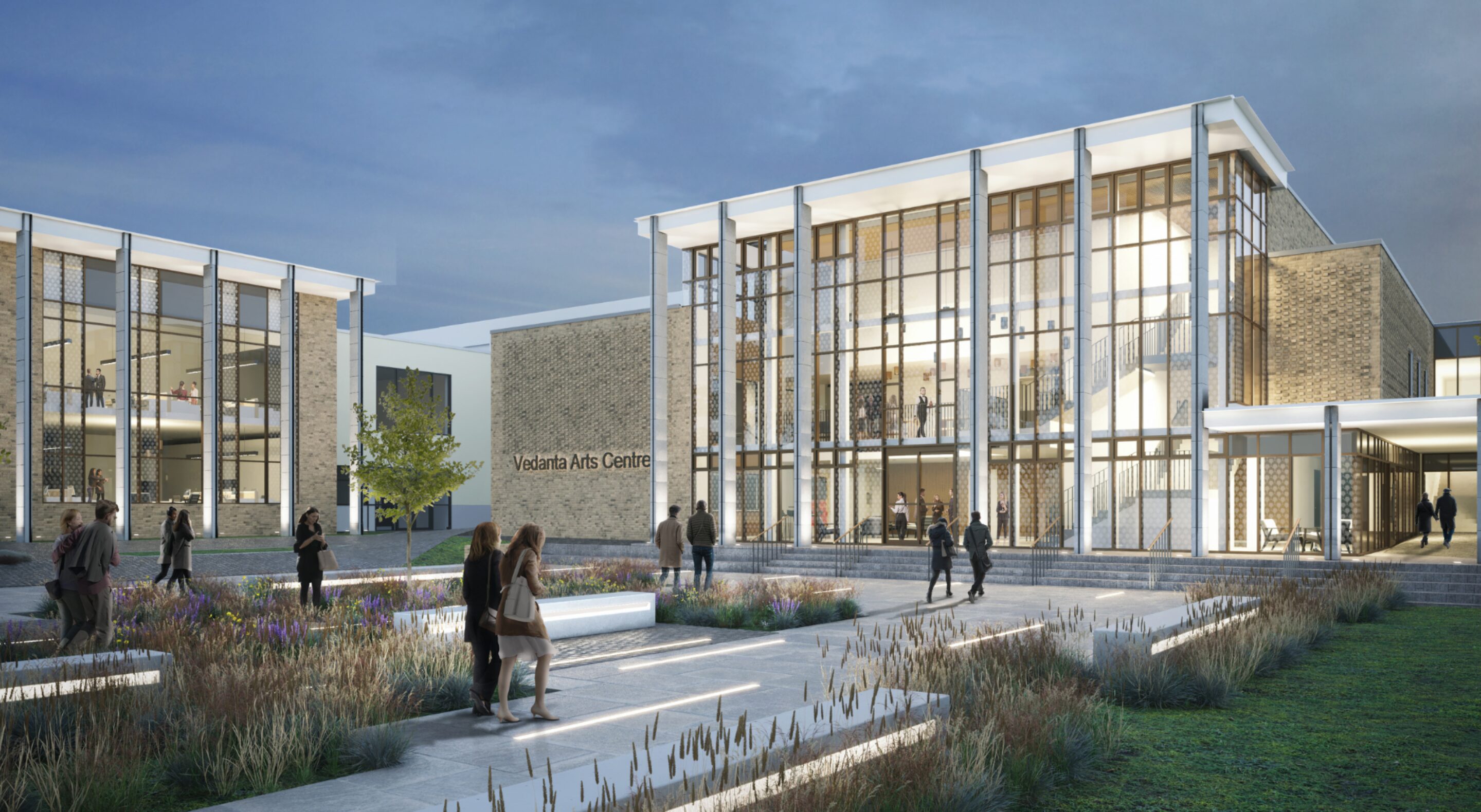 The Vedanta Arts Centre was envisioned as a new building housing a theatre with capacity to accommodate a total of 400 people, and with the assembly hall to be designed to host wedding events and other functions, providing a source of revenue to Avanti Schools Trust. Additional facilities included a restaurant, multi-use studio, classroom and presentation space.