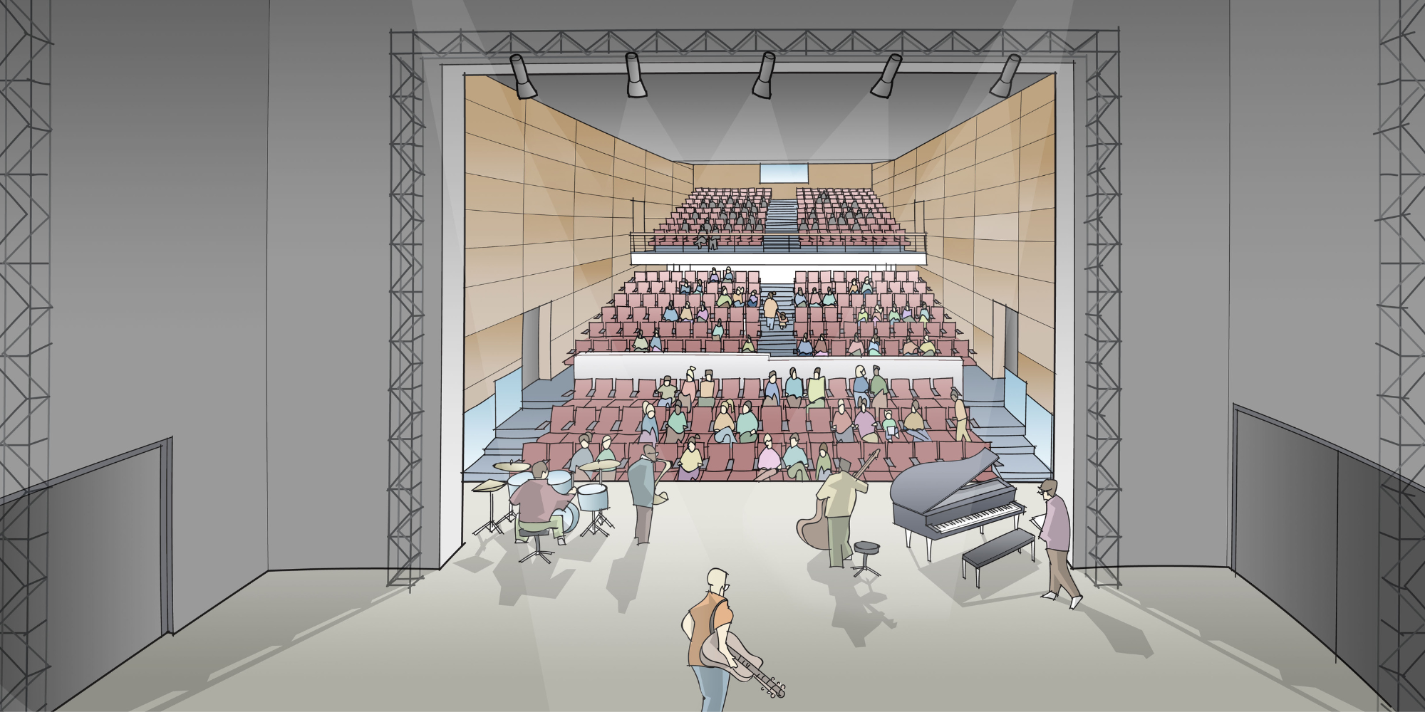 Design changes made to provide the required standard of theatre included making stage wings larger and get-in doors taller, providing storage off the stage, providing light/sound lobbies, and making elevation changes.